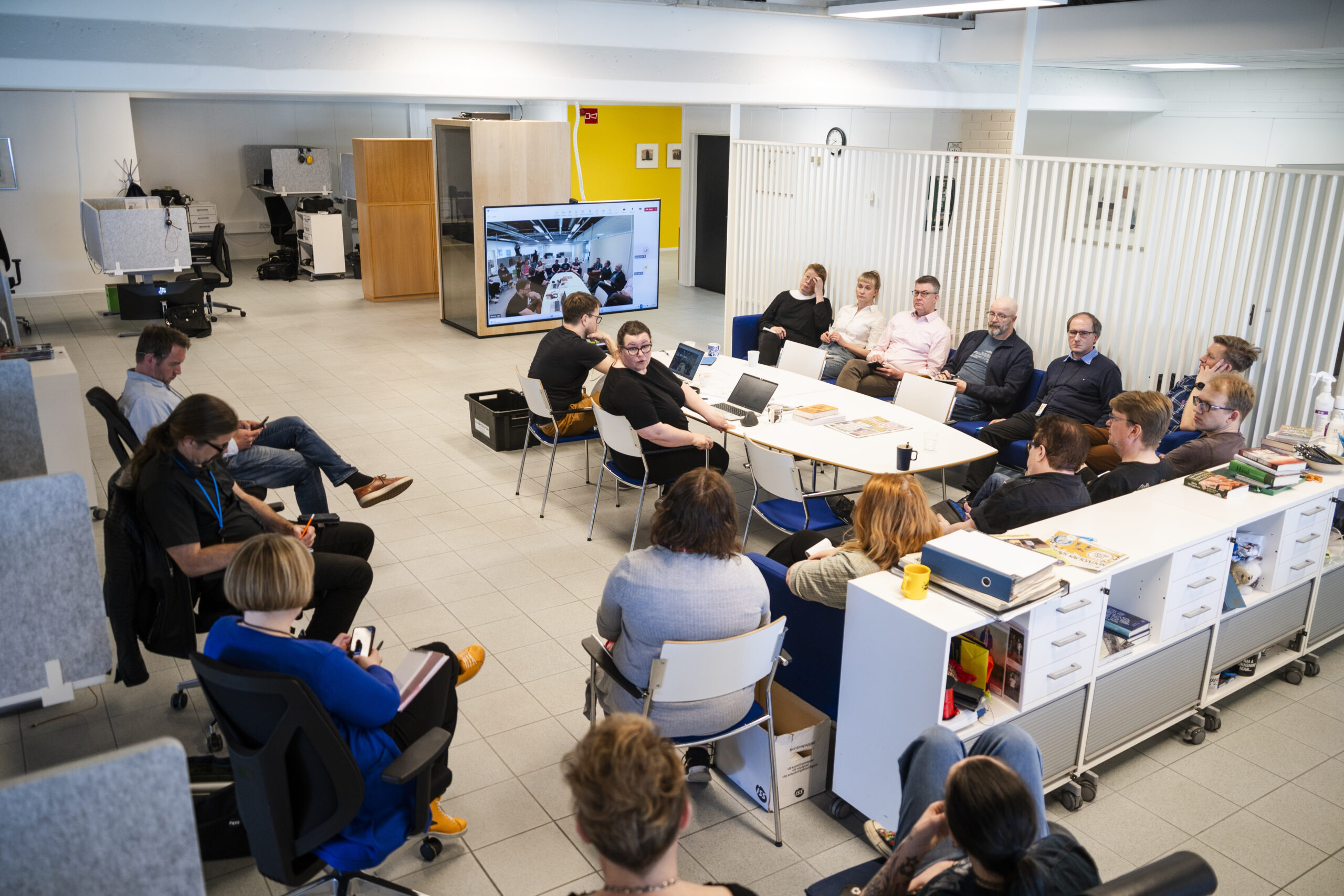 Toimituksen väki kokoontuu hiljalleen pöydän ääreen. Pari heistä osallistuu kokoukseen etänä. Paikalla on tänä aamuna noin viisitoista henkilöä.