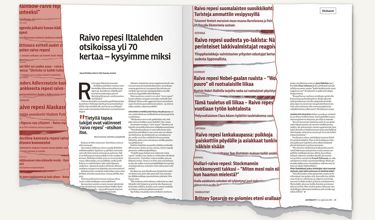 Journalisti kirjoitti numerossa 7/2025 Iltalehden tavasta käyttää raivo repesi -sanaparia otsikoinnissaan. Toimittaja Janne Flinkkilän selvitys paljasti, että Iltalehti on käyttänyt ilmaisua jo yli 70 otsikossaan – ja kuluvan vuoden syyskuussa jopa useita kertoja viikossa.