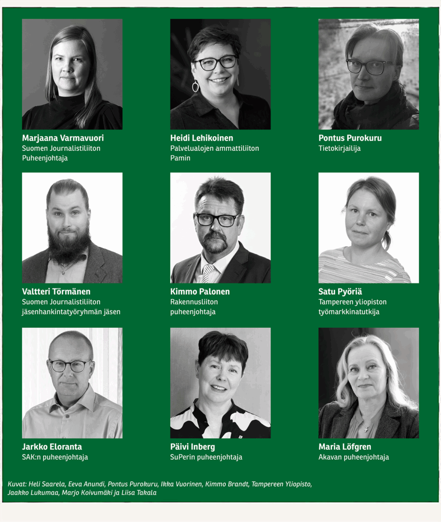 Kysyimme tätä juttua varten ammattiliitoista, tietokirjailijalta ja tutkijalta, mitä ammattiyhdistysliikkeen vaikutusvallasta on jäljellä. Työehtosopimuksia solmitaan jatkossakin, ja jäsenten etua valvotaan, mutta miten liitot voisivat parantaa suomalaisten työelämän laatua? Mitä uutta niiden pitäisi keksiä ollakseen edelleen tärkeitä jäsenilleen?