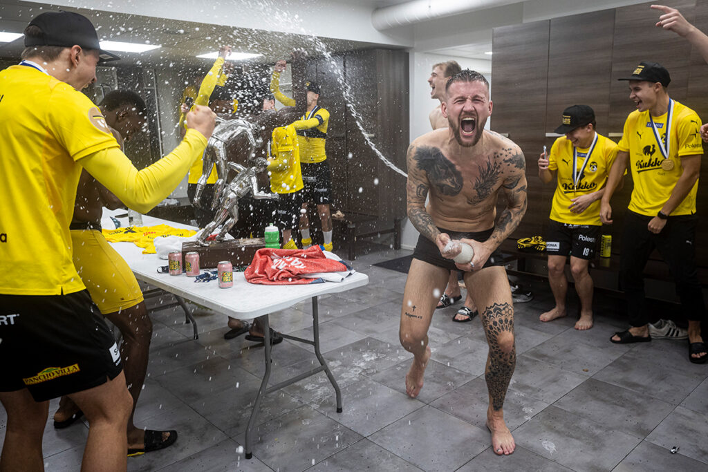 ”Nyt KuPS:n edustaja päästi meidät sisään jo mestaruusjuhlien ollessa ihan oikeasti käynnissä. Pukukoppijuhlissa ei ­sillä hetkellä ollut muita medioita”, Savon Sanomien valokuvaaja Jussi ­Pohjavirta kertoo.