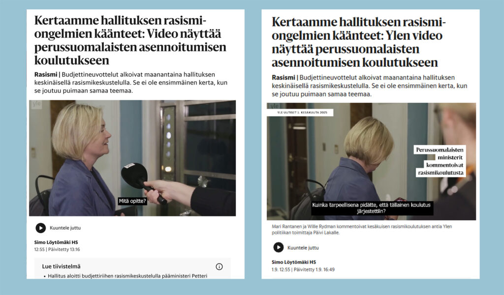 Helsingin Sanomat julkaisi 1. syyskuuta jutun Suomen hallituksen rasismiongelmien käänteistä. Heti otsikon ja ingressin jälkeen jutussa oli video, jossa sisäministeri Mari Rantanen (ps.) ja elinkeinoministeri Ville Rydman (ps.) kommentoivat hallituksen kesäkuista rasismikoulutusta.