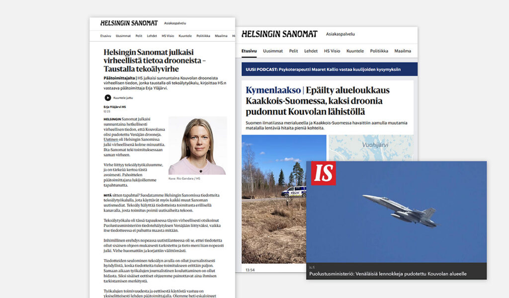 Helsingin Sanomat, Ilta–Sanomat ja Aamulehti julkaisivat viime sunnuntaina tekoälytyökalun tuottaman virheellisen tiedon, jonka mukaan Suomessa olisi pudotettu venäläisiä drooneja. Ainakin toinen drooneista on myöhemmin tunnistettu ukrainalaiseksi, ja pudottamisen sijaan ne löytyivät pudonneina.
