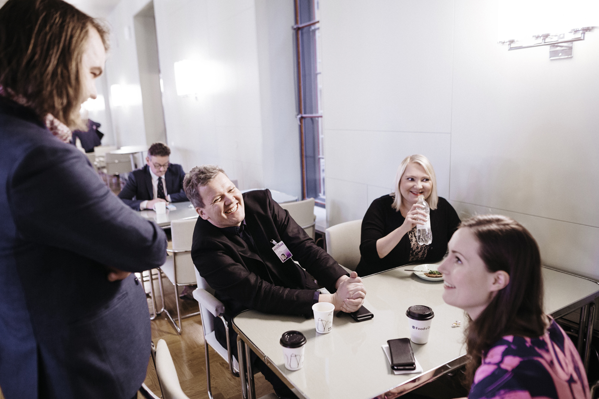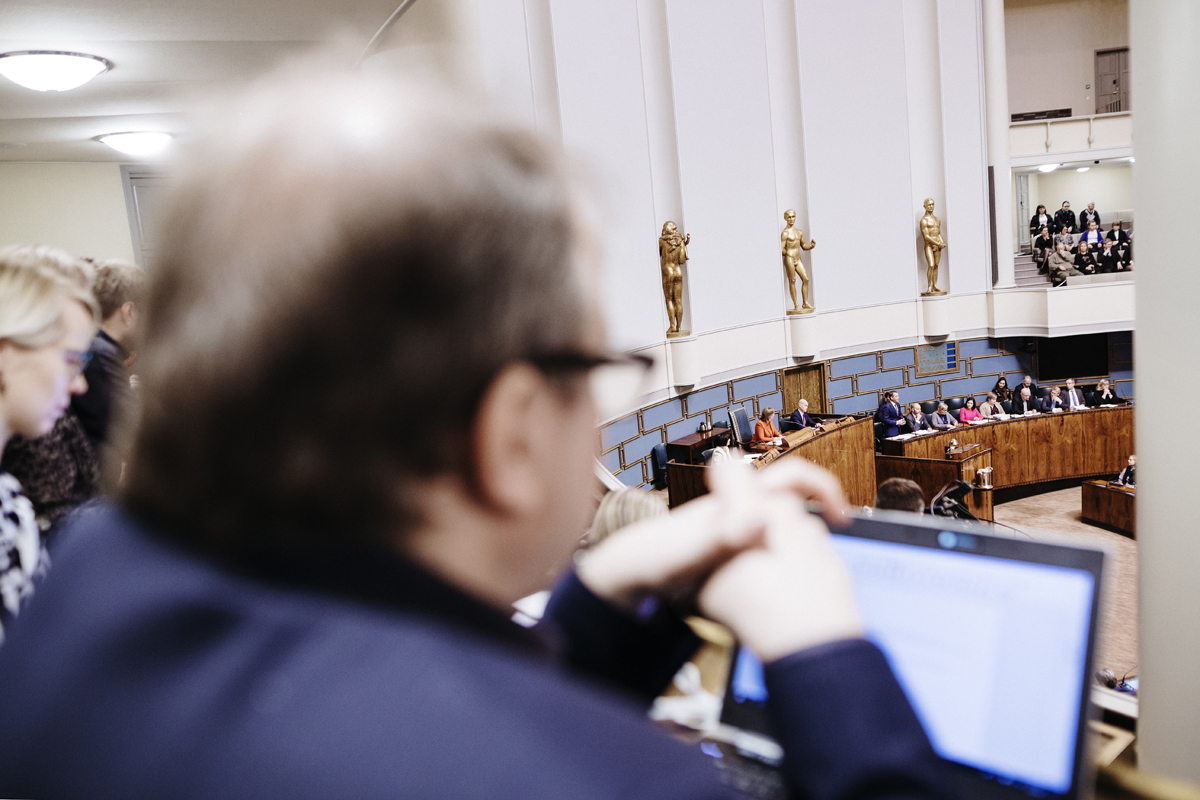 Mutta tuolta tuleekin jo Petteri Orpo, jonka toimittajat pian ympäröivät. Kymmenisen minuuttia kestävän sarjahaastattelun jälkeen Orpo katoaa kokoomuksen huoneeseen ja Ijäs menee demarien ryhmäkokoukseen, jossa Demokraatin toimittaja saa ainoana median edustajana halutessaan olla paikalla.