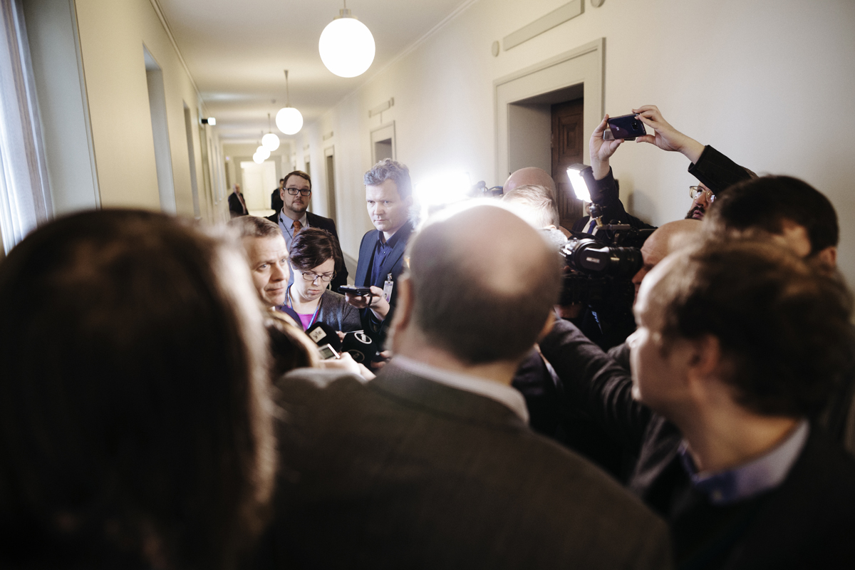 Toimittajalauma kuhisee kokoomuksen eduskuntaryhmän huoneen edustalla. Toimittajat ja kuvaajat odottavat valtiovarainministeri Petteri Orpoa (kok.), jolta halutaan kommentteja puolueen heikkoon gallupmenestykseen.